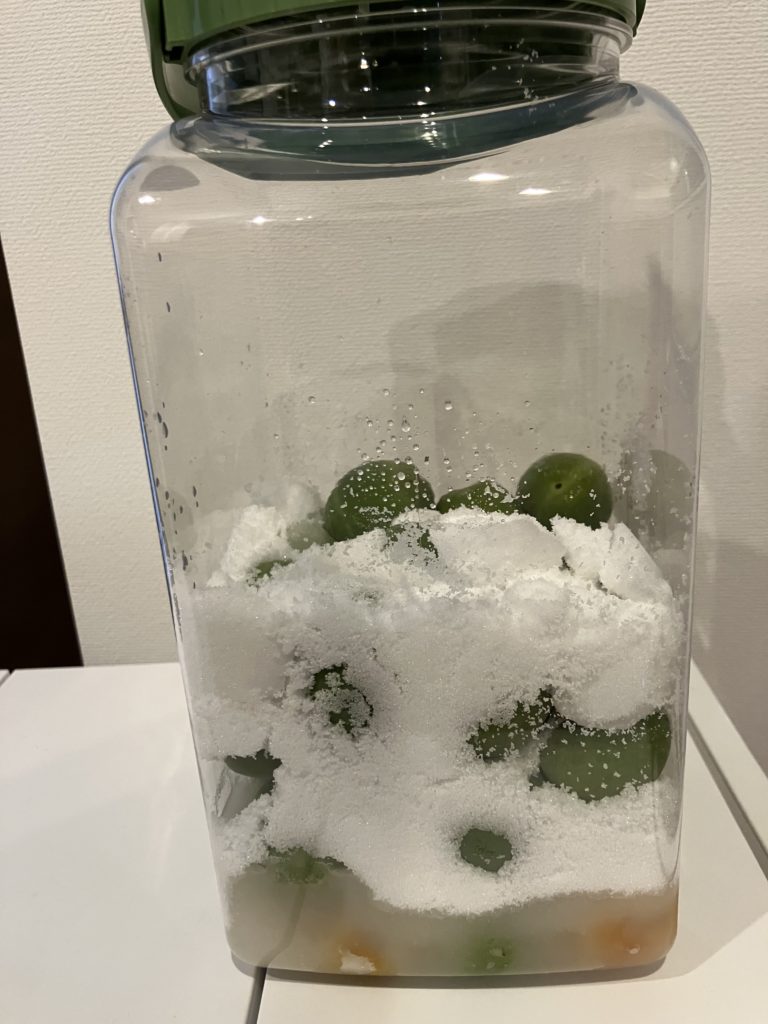 こちらは砂糖で漬けて、毎日砂糖と梅が混ざるように瓶を振っていました