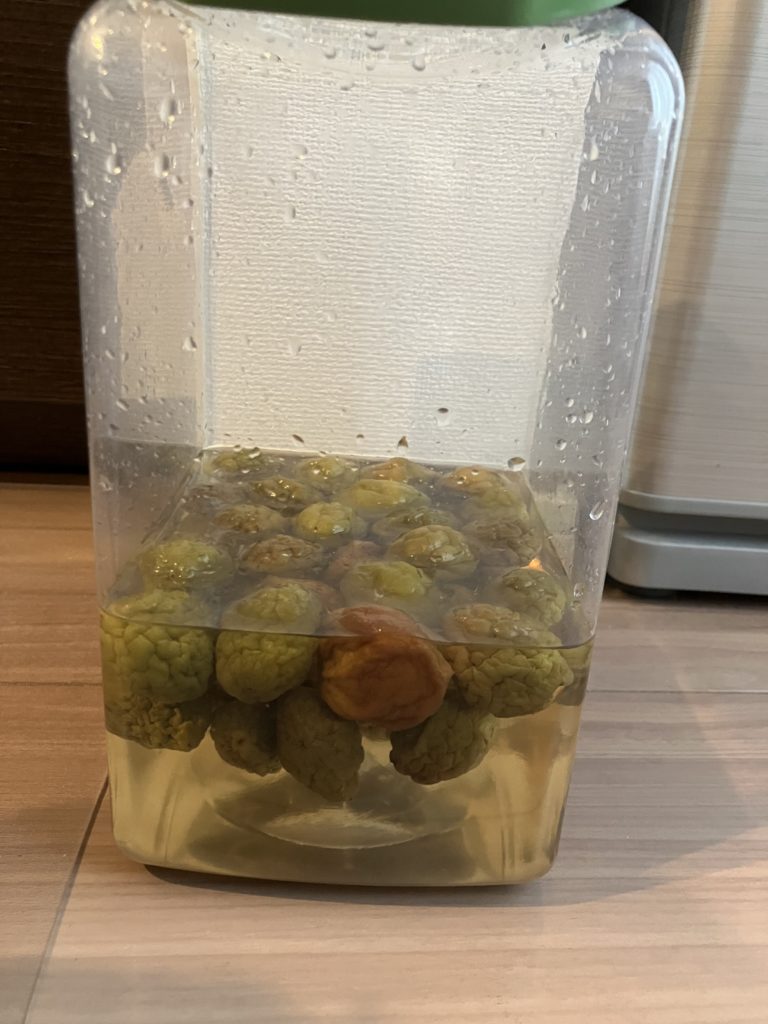 例年は梅に対して20%の塩で漬けていましたが、あまりにも酸っぱいので今年は冒険して10%で漬けてみました
